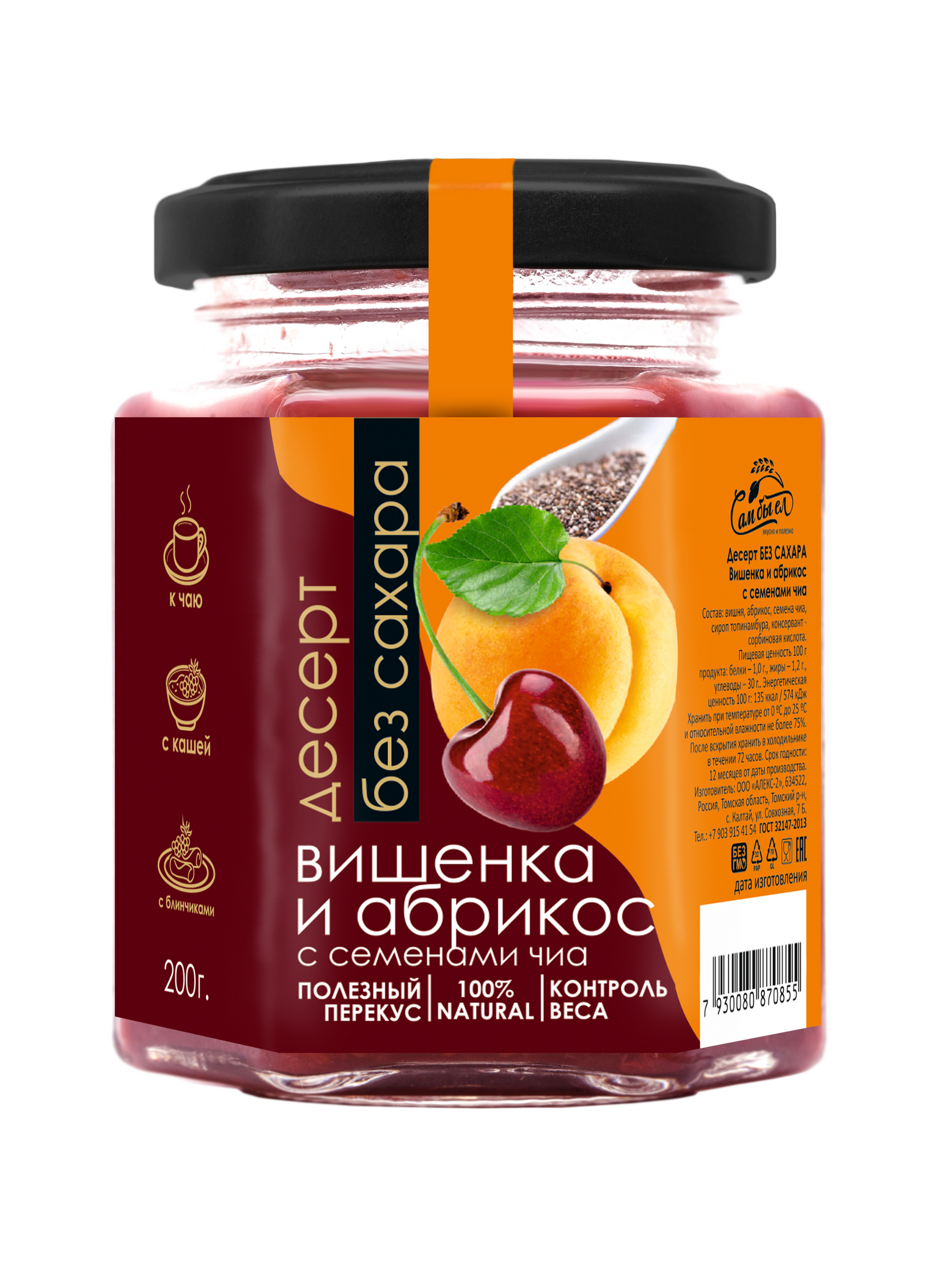 Ingredients: Apricot purée, whole cherries, chia seeds, Jerusalem artichoke syrup (no added sugar, no water).