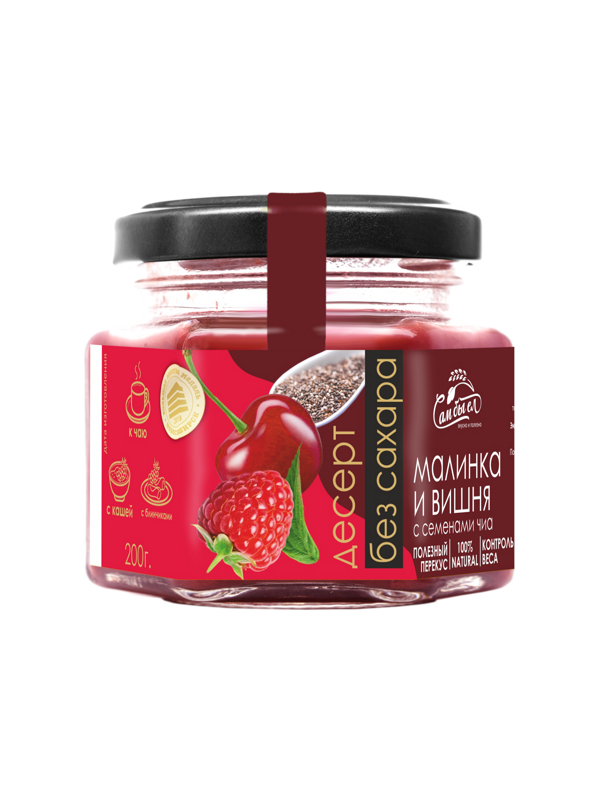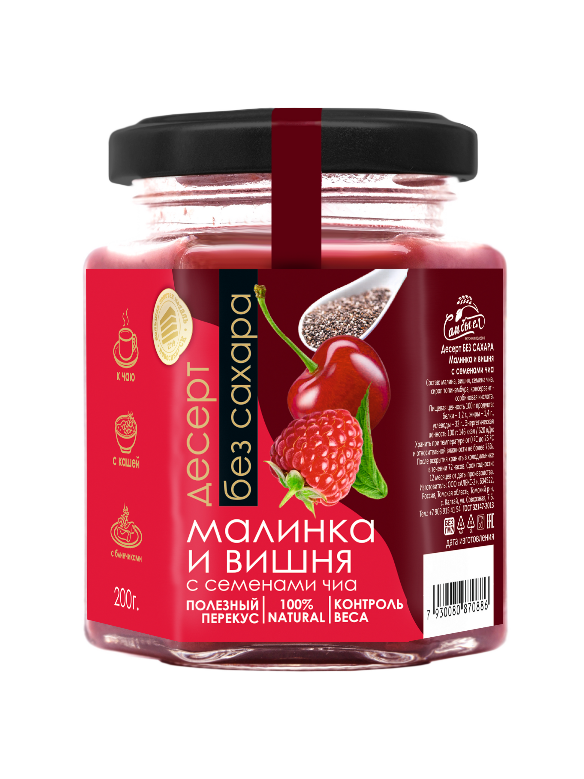 Ingredients: Raspberry purée, whole cherries, chia seeds, Jerusalem artichoke syrup (no added sugar, no water).